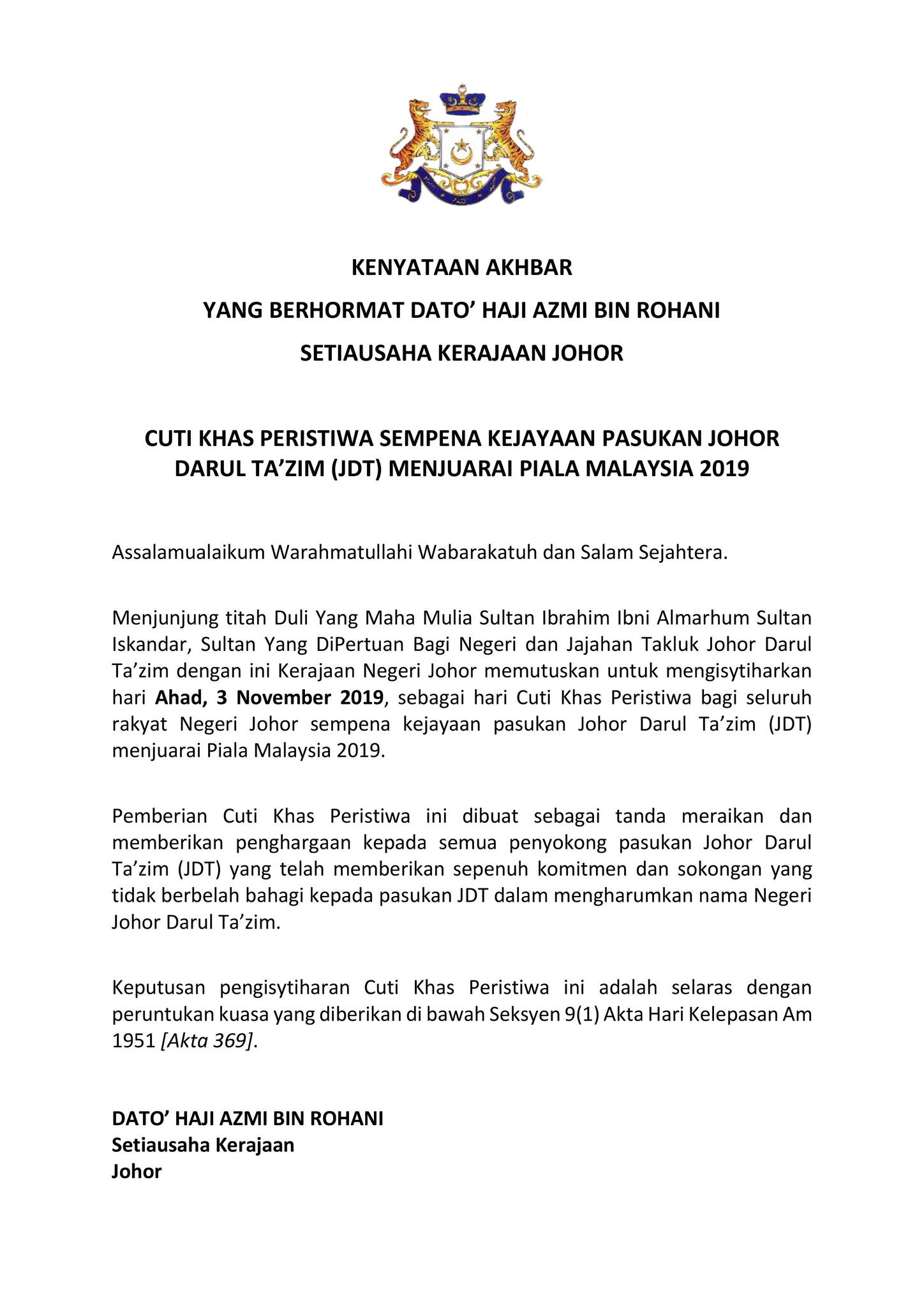 Mpp Uitm Pasir Gudang On Twitter Assalamualaikum W B T Merujuk Kepada Kenyataan Akhbar Yang Telah Dikeluarkan Oleh Pejabat Setiausaha Kerajaan Negeri Johor Adalah Dimaklumkan Bahawa Pada 3 November 2019 Ahad Diumumkan Sebagai Hari